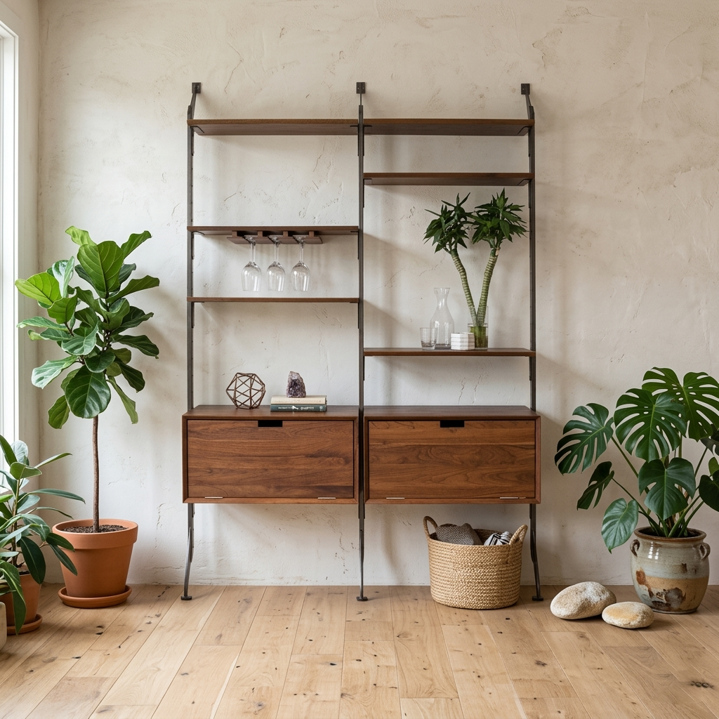 The Apollo Modular System: Dining Room 1 configuration is composed of two Ciao Drop Down Cabinets and six 29" Ciao Shelves all held in place by three iron Apollo Verticals and secured by iron brackets. It also features our Wine Glass Rack which makes this Apollo perfect for any dining area.