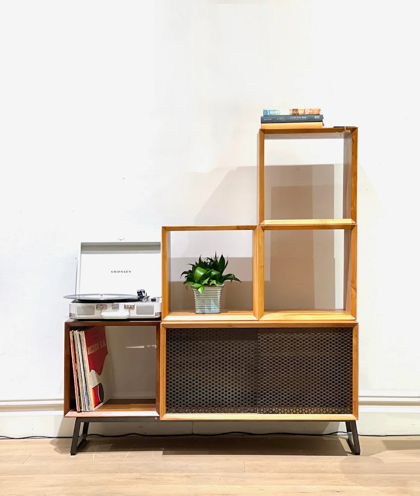 Sturdy, minimal lightweight iron base is designed to hold Ciao modular storage boxes. Adjustable levelers serve as floor protection. It comes in three size options to accommodate standard Ciao boxes which can sit atop bases or be attached to them with screws. Clear finished iron suitable for indoor use.