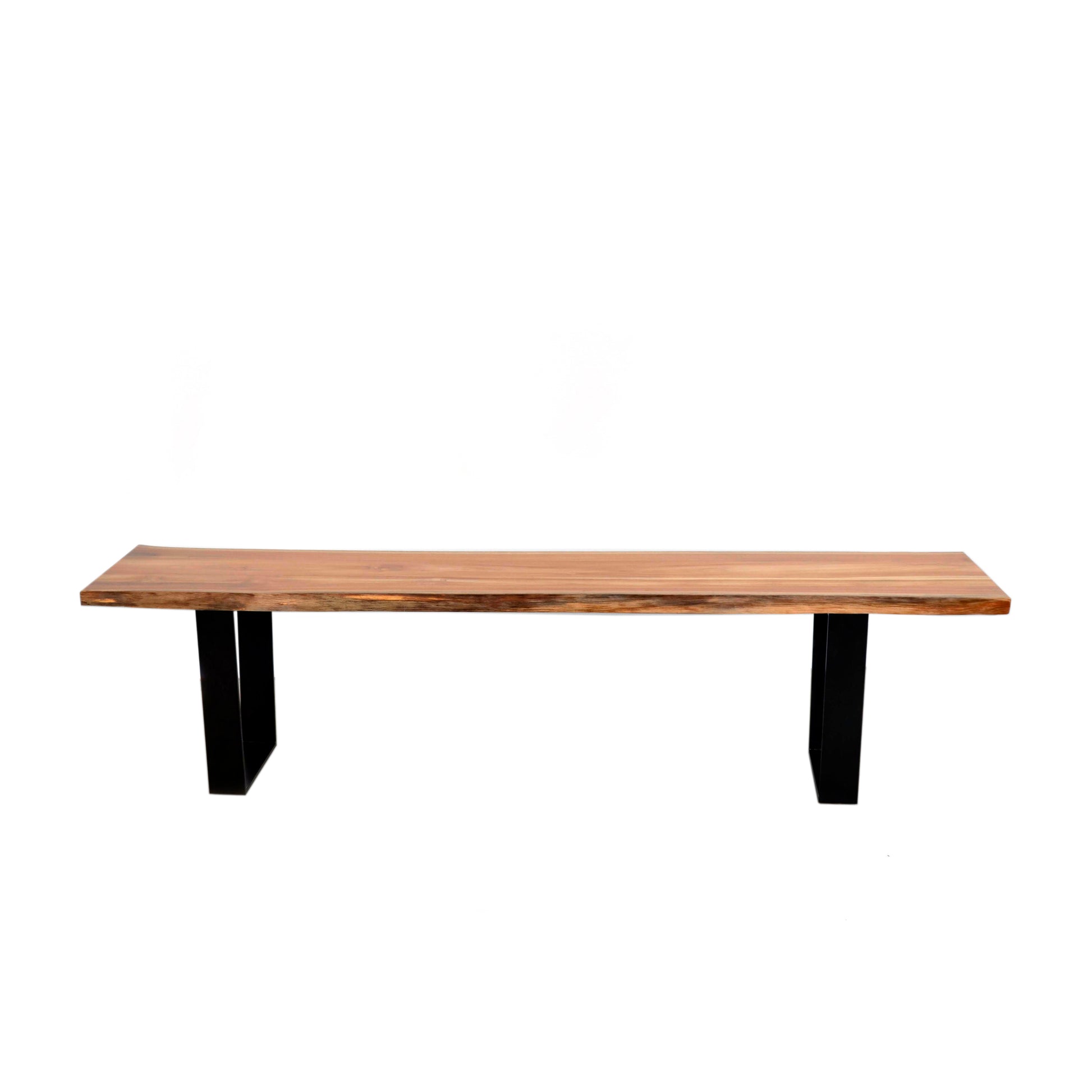 The Kali Live Edge Orion Bench features a live edge hardwood top, available in two different lengths, and paired with a set of our iron Orion bases.