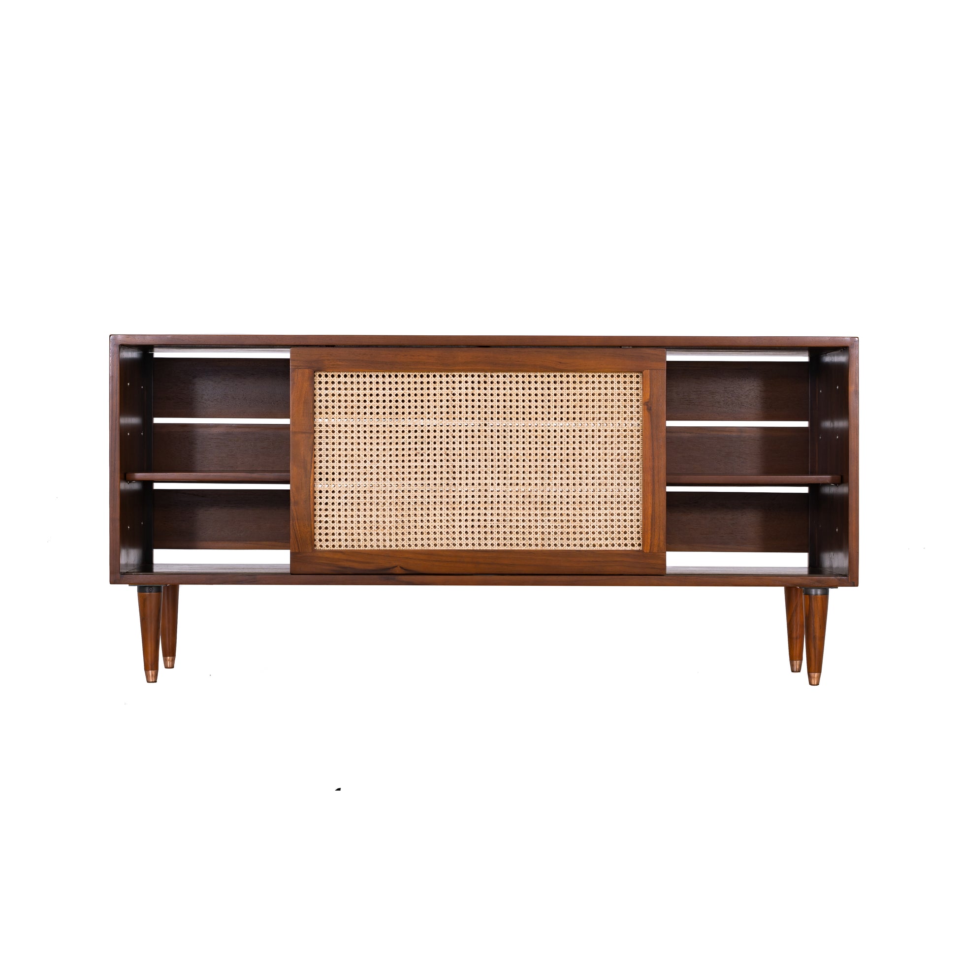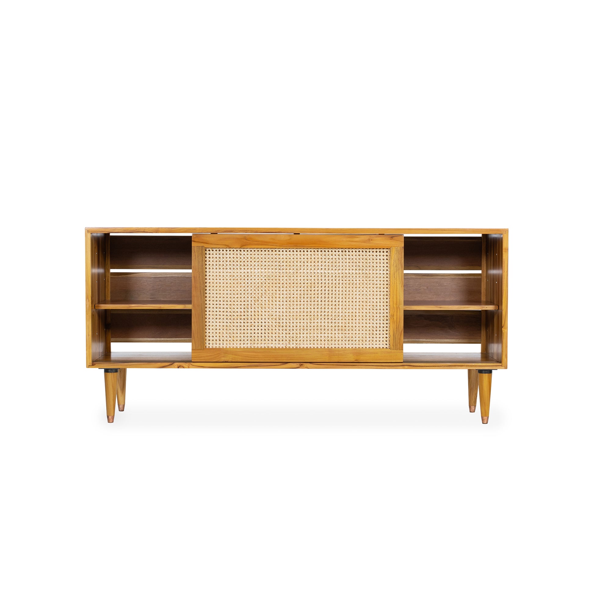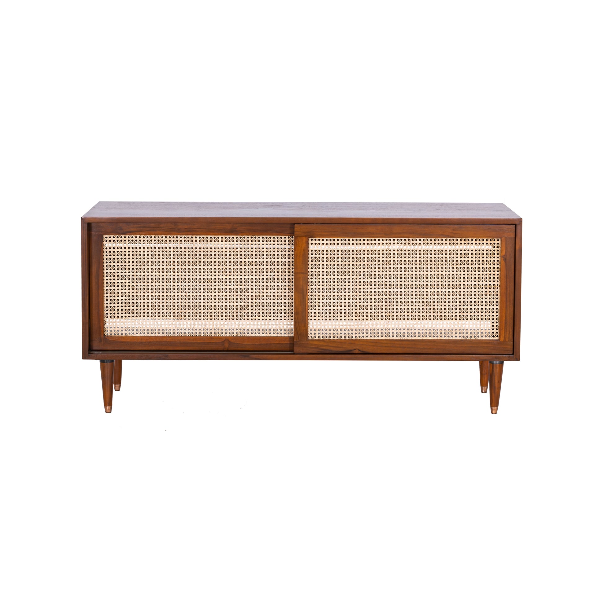 Kengo Collection  is the new collection that features solid wood frame and airy inserts of natural hand woven rattan. Solid wood back paneling completed with wire management slats for easy use of media equipment. Sliding Door Feature and remote accessible hand woven rattan.