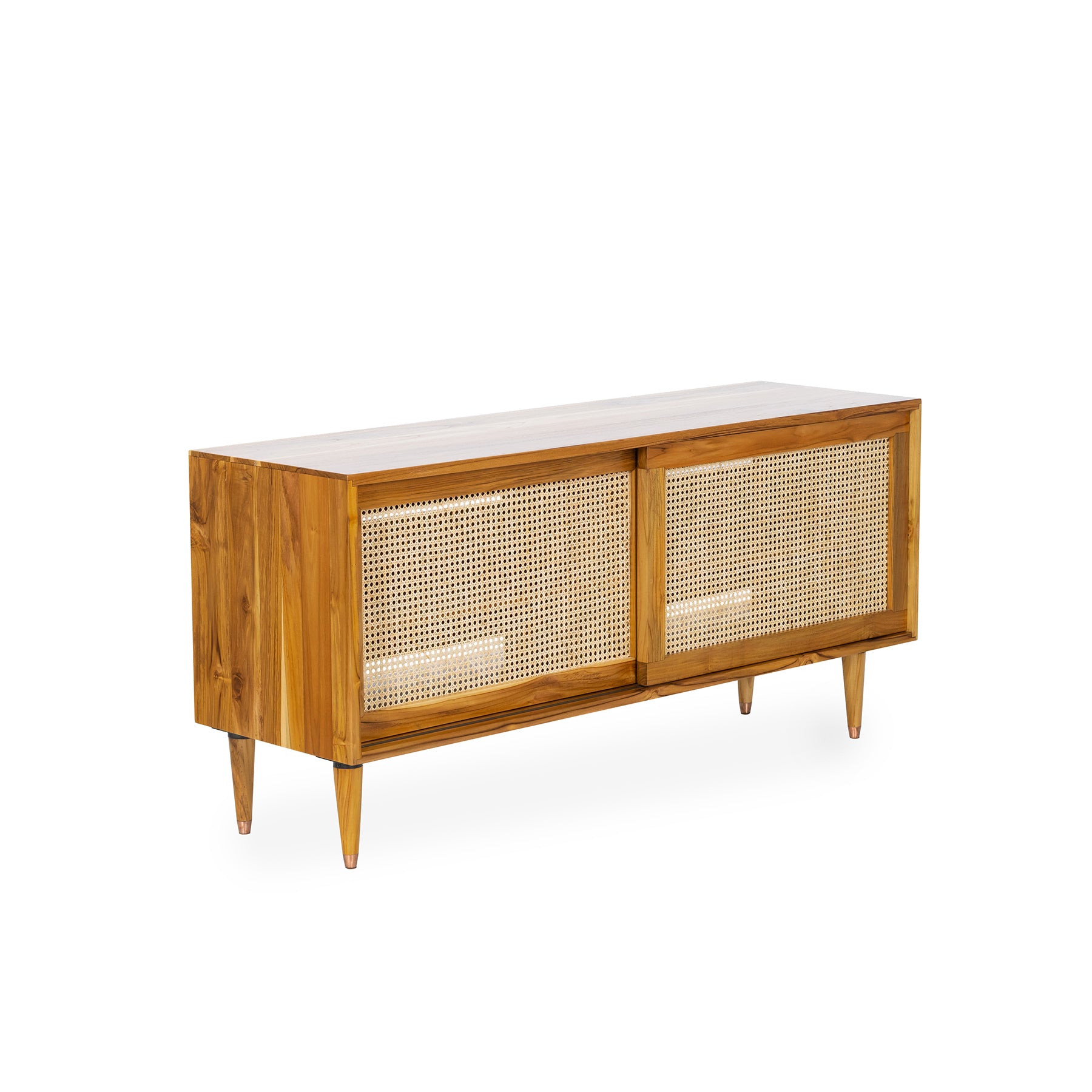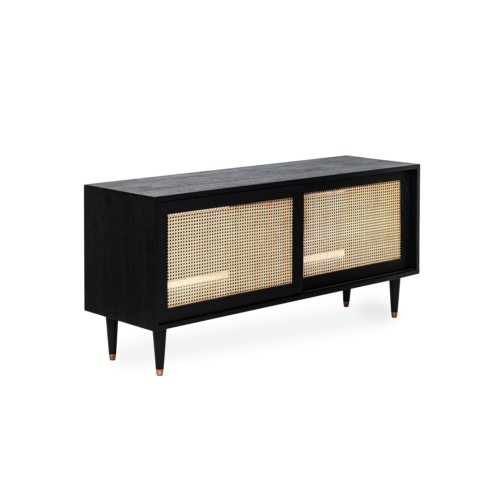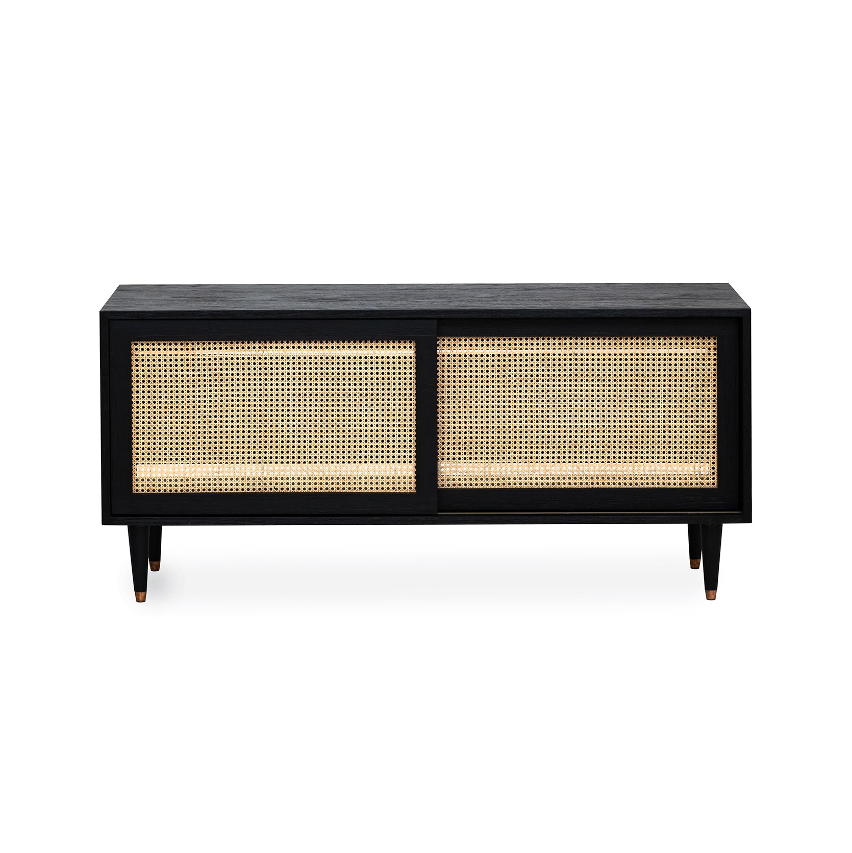 Kengo Collection  is the new collection that features solid wood frame and airy inserts of natural hand woven rattan. Solid wood back paneling completed with wire management slats for easy use of media equipment. Sliding Door Feature and remote accessible hand woven rattan.