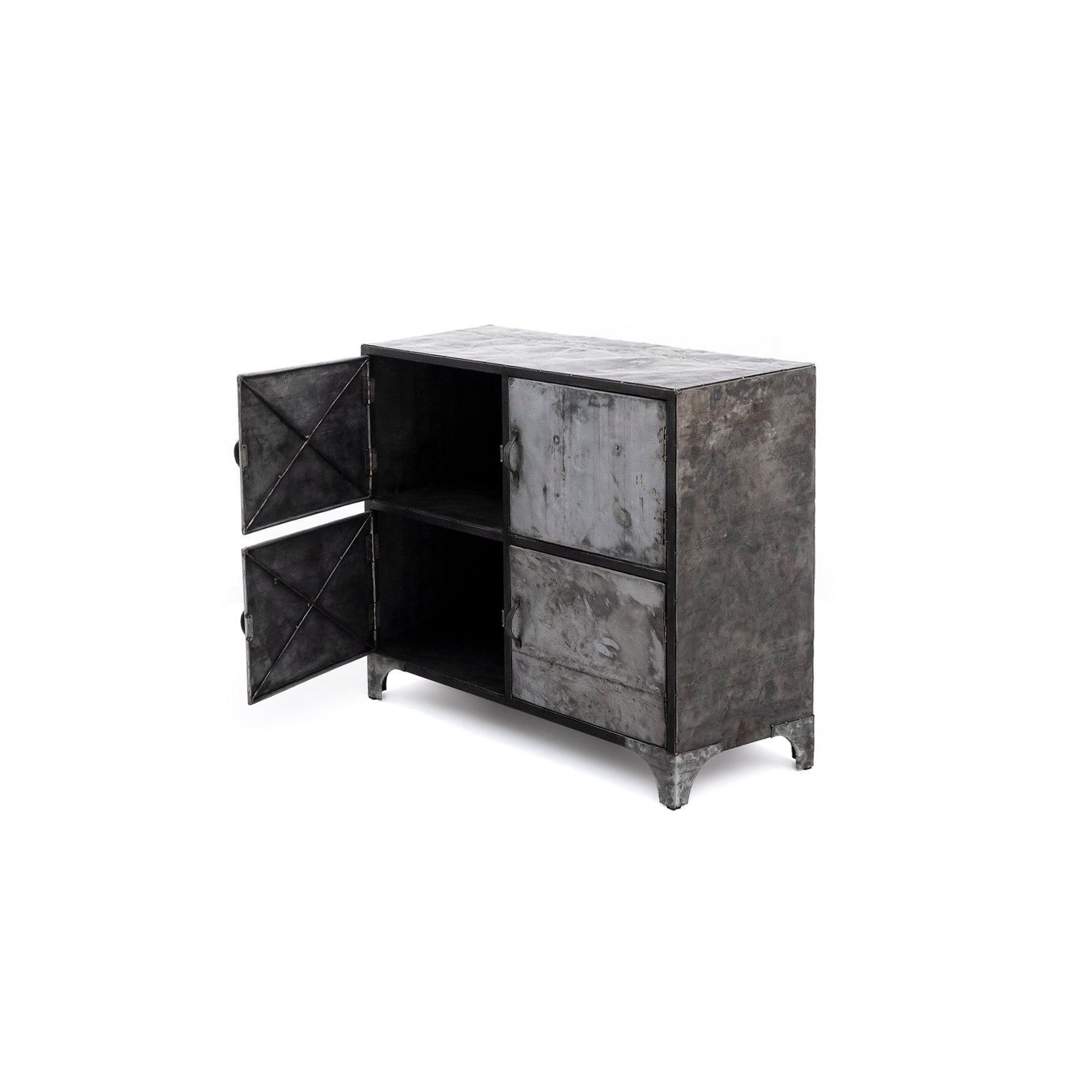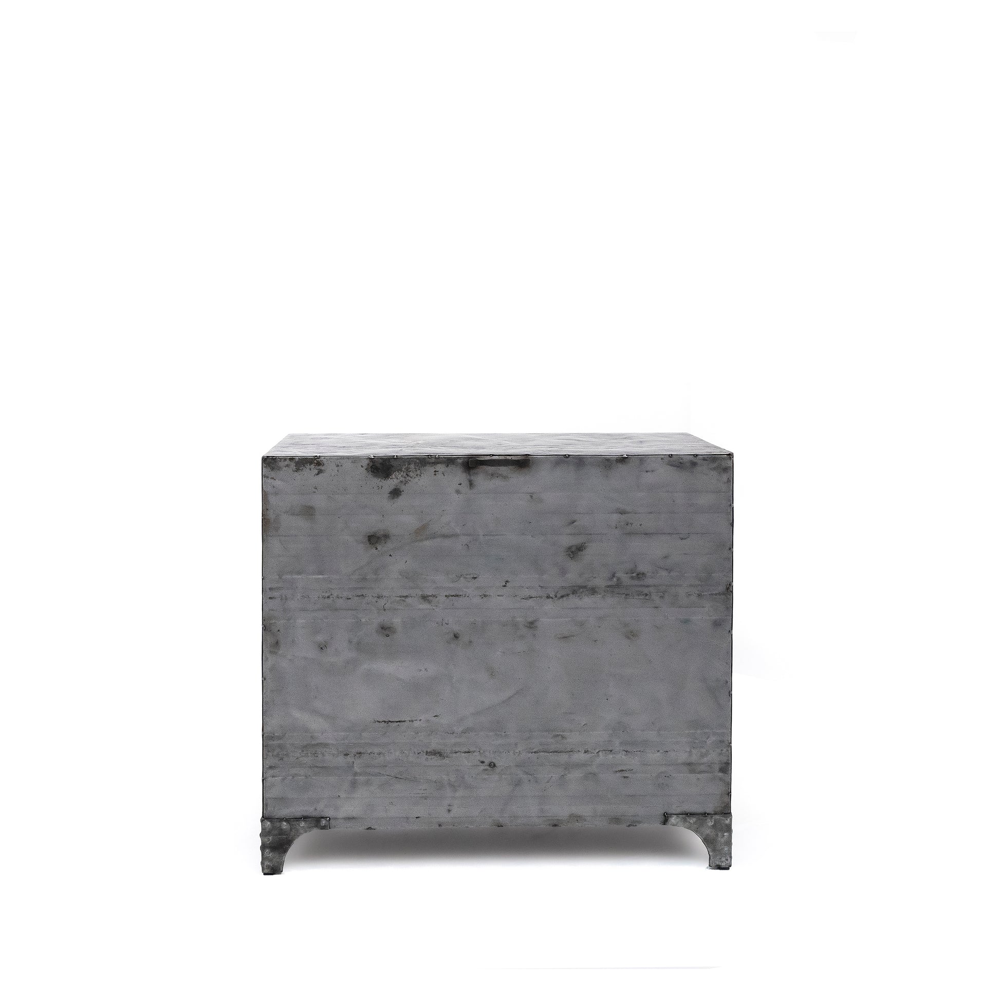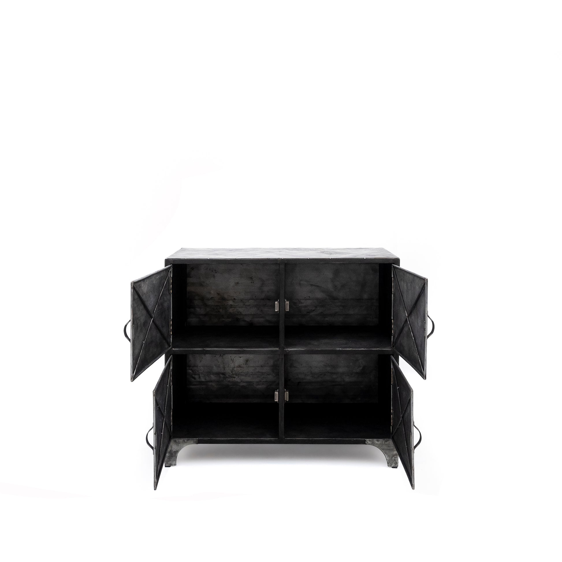 Lancar is a storage collection made of recycled oil barrels as a part of our sustainable initiative. Each unit features hand assembled metal panels, welded onto an iron frame. Surfaces carry character of their original texture that is artistically preserved to