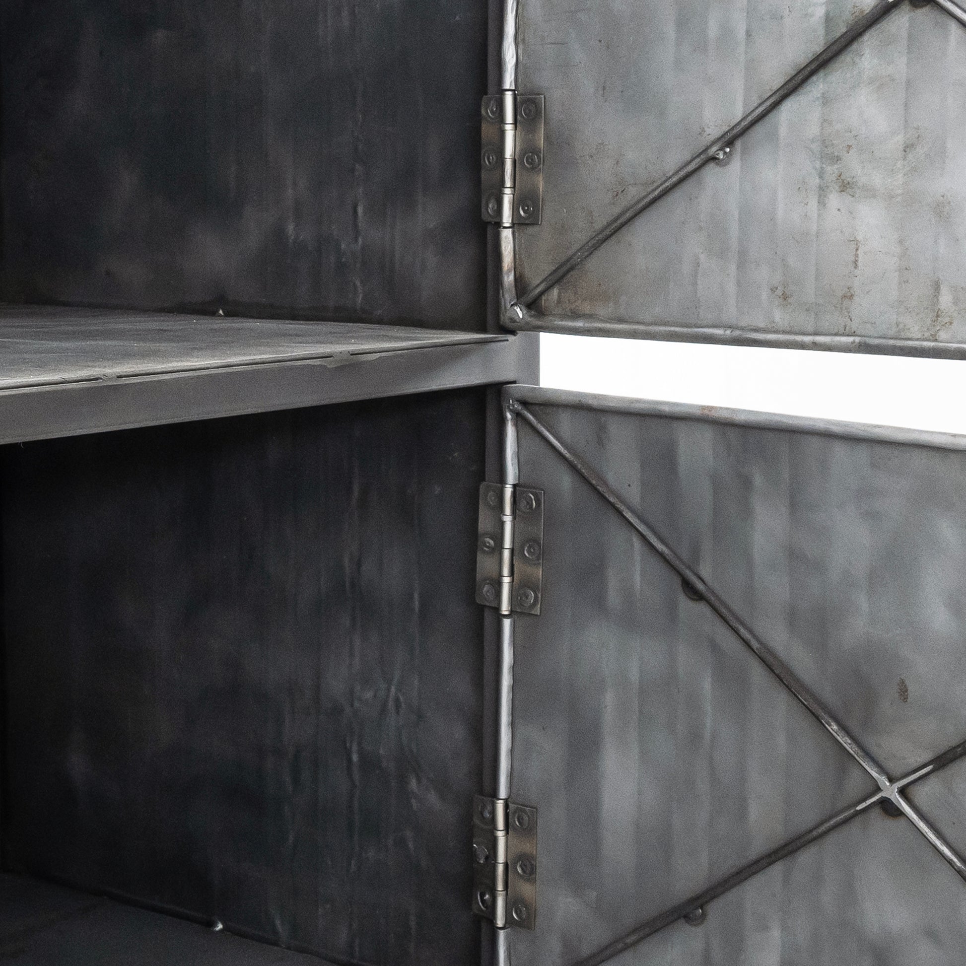 Lancar is a storage collection made of recycled oil barrels as a part of our sustainable initiative. Each unit features hand assembled metal panels, welded onto an iron frame. Surfaces carry character of their original texture that is artistically preserved to