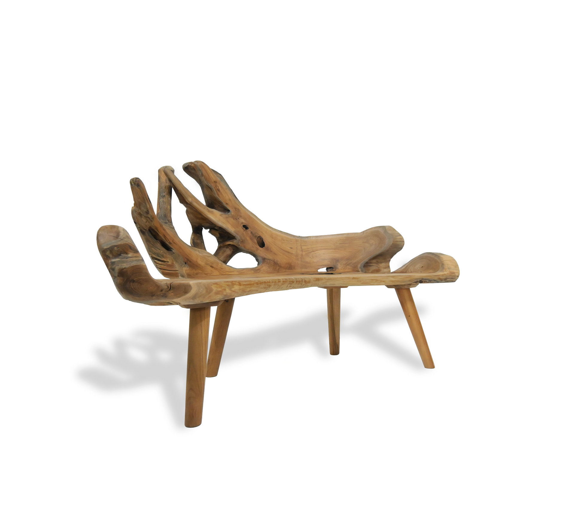 Our Root Benches are unique, organic and are suitable to be used outdoors. Each bench is one of a kind. We hand-select pieces of teak root shaped by nature, that inspire design and functionality. Legs are added from the teak trunks.